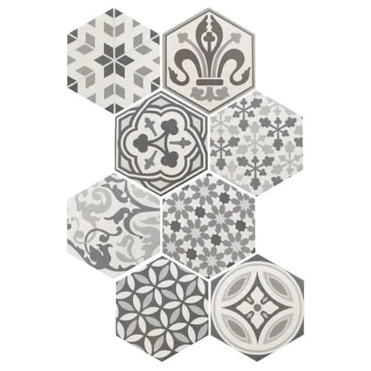 Hexatile Harmony is a range of porcelain hexagonal pattern tiles. Each box contains a random mix of patterns, allowing you to create a distinct look in your home.