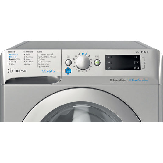 Indesit Steam Push&Go Washing Machine | SILVER | 9kg | 1400rpm | A Rated | BWE 91496X SV UK